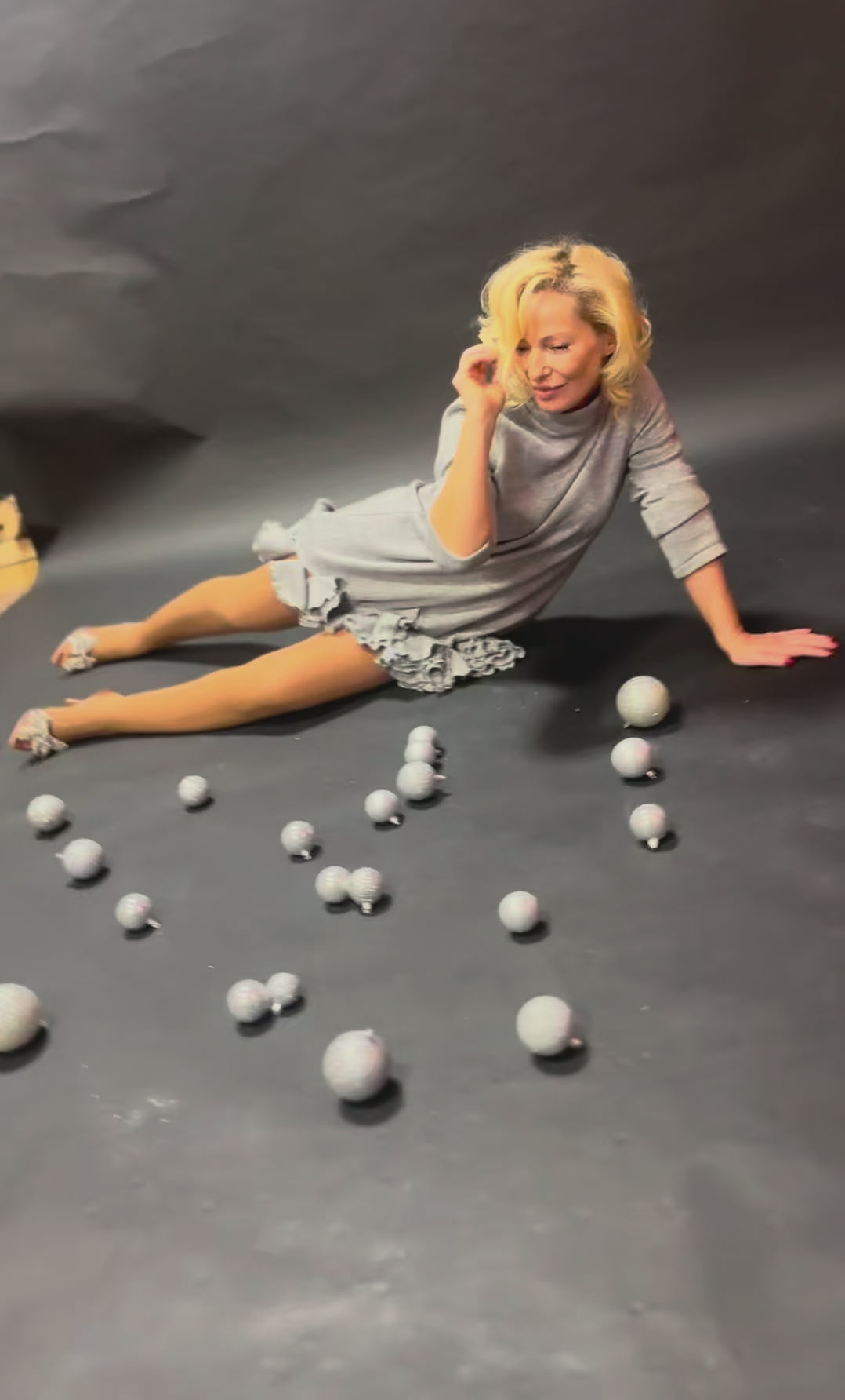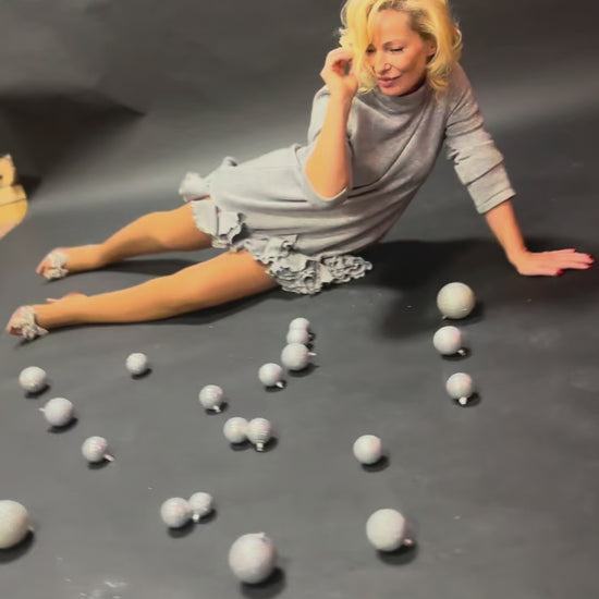 The Moon Ruffle Dress combines coziness and elegance in perfect balance. Made from soft grey knit fabric with silver threads. The relaxed silhouette drapes smoothly along the body, while the ruffle at the hem adds movement and a delicate charm. The design is finished with a soft high collar that frames the face and adds a modern touch.