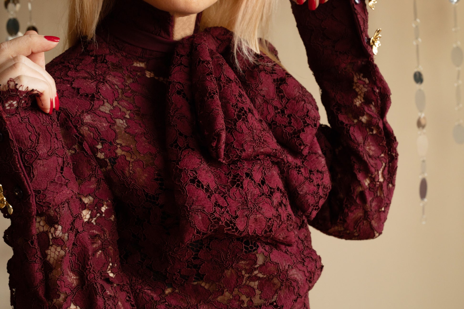 The Burgundy Poème Shirt is a delicate expression of romance and timeless elegance. Crafted from fine burgundy lace, it softly reveals the silhouette while preserving a graceful and sophisticated presence. The front ribbon detail adds a poetic accent, drawing attention to the neckline and enhancing the feminine character of the design. Long sleeves balance the transparency of the lace, creating harmony between sensuality and refinement. Designed to be worn as part of a coordinated ensemble or styled on its own, this shirt embodies the ÉNGELE philosophy of understated luxury and emotional design.