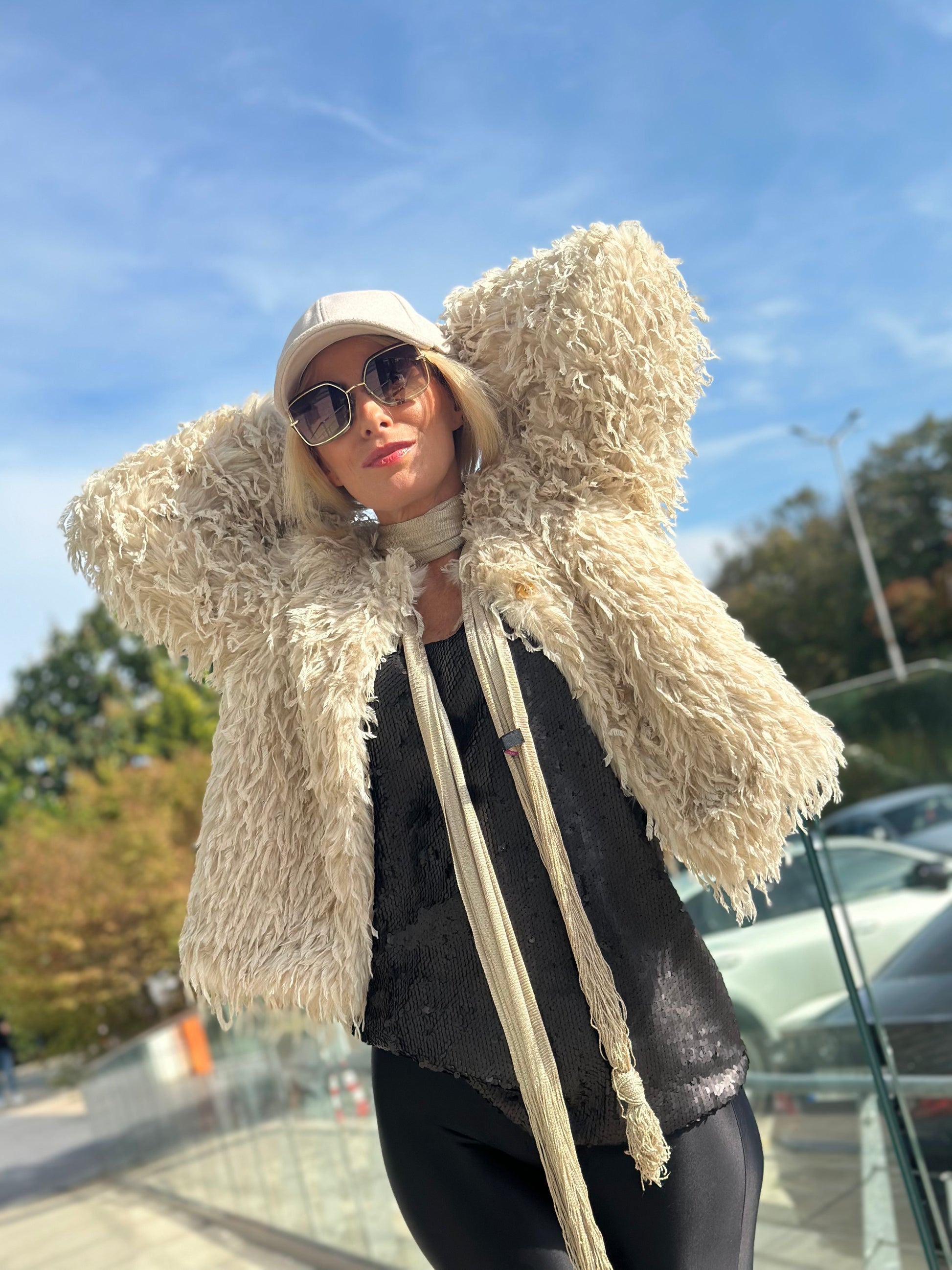 The Ivory Feather Touch coat embodies style and softness. Crafted from plush eco-friendly fabric with delicate feather-like texture, it offers warmth and comfort. This relaxed-fit coat is fully lined and fastens with hidden buttons. Wear it over jeans for urban chic or paired with a dress for evening elegance – it always makes a striking impression.