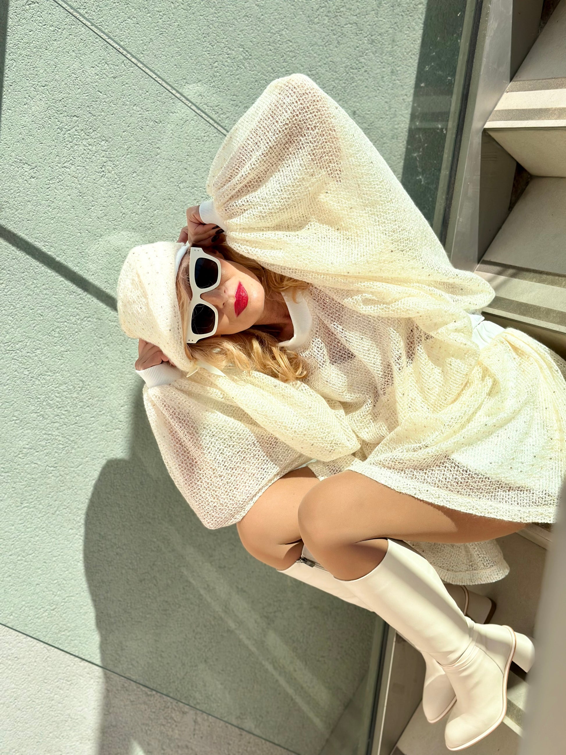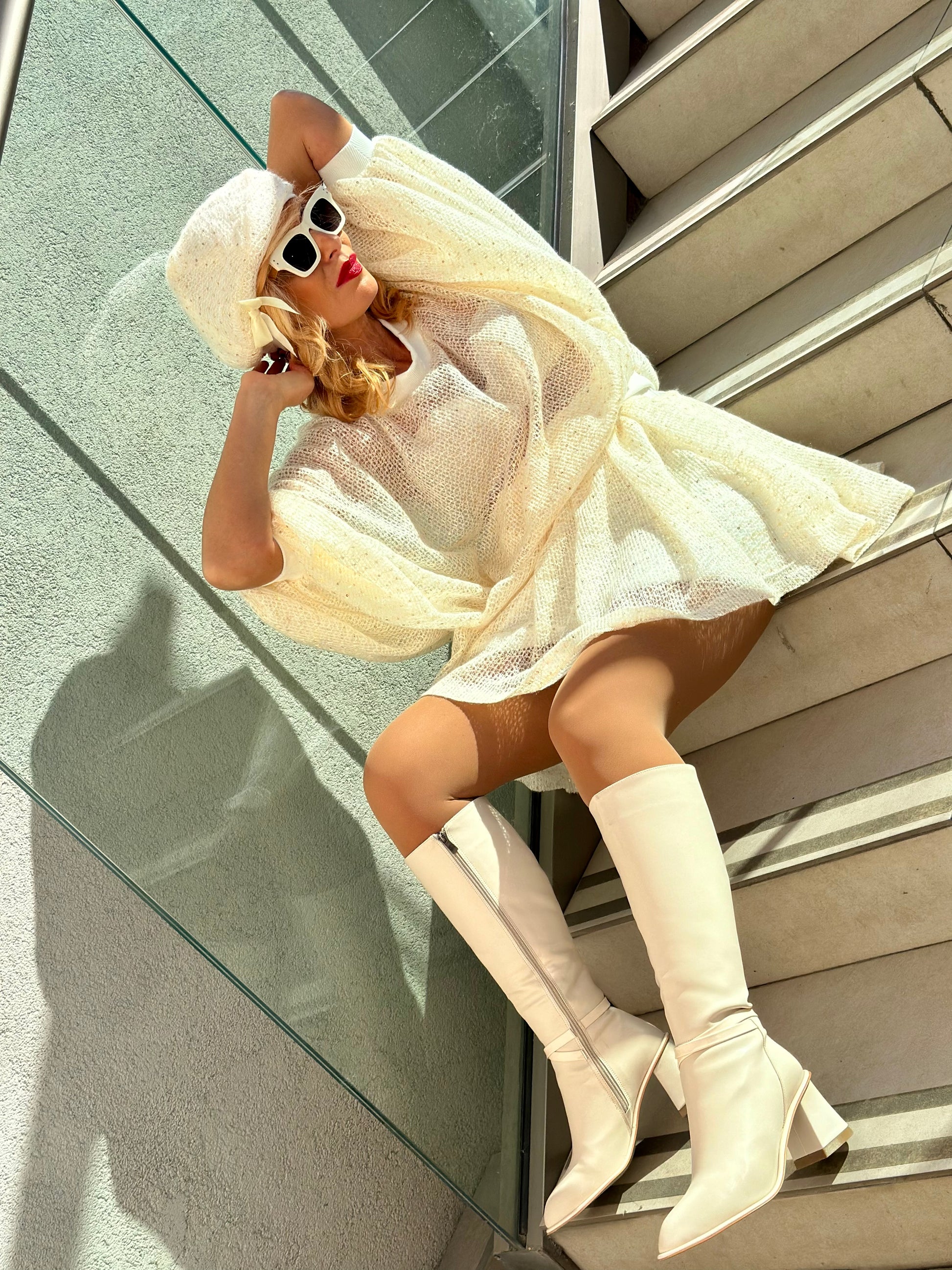 The Snow Mist Beret is the perfect finishing touch for a refined winter look. Made from the same airy bouclé fabric with soft sequins, it brings a hint of sparkle and timeless French charm. Its plush texture and elegant simplicity make it a standout accessory — whether paired with the matching blouse or styled as a statement piece on its own.
