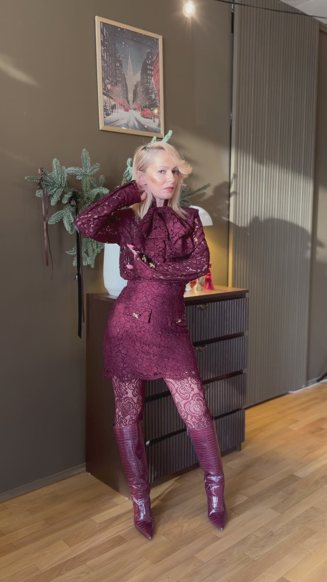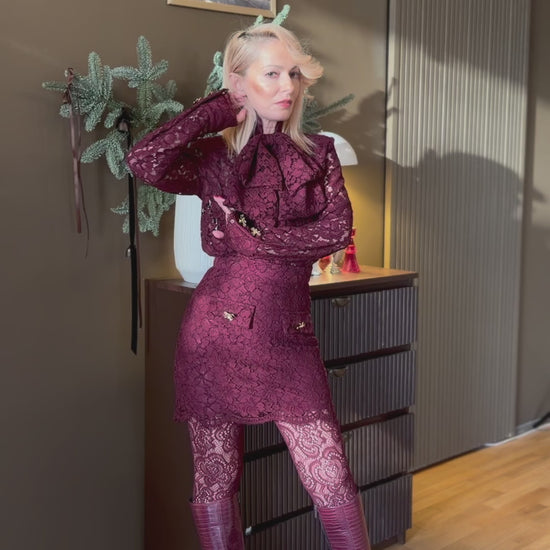Бордовата пола Poème възхвалява текстурата и женствеността чрез изчистен, изискан силует. Изработена от луксозна бордо дантела, тя следва тялото с елегантност и мекота. Декоративните акценти на предните джобове с фини метални детайли добавят вдъхновен от висша мода щрих, издигайки дизайна, без да засенчват романтичната му същност. Фенеровият дантелен подгъв подчертава деликатността на плата, а мини дължината внася модерен, уверен вид. Независимо дали е носена като част от съответстващ комплект или е стилизирана индивидуално, тази пола отразява визията на ÉNGELE за вечна красота със съвременен чар.