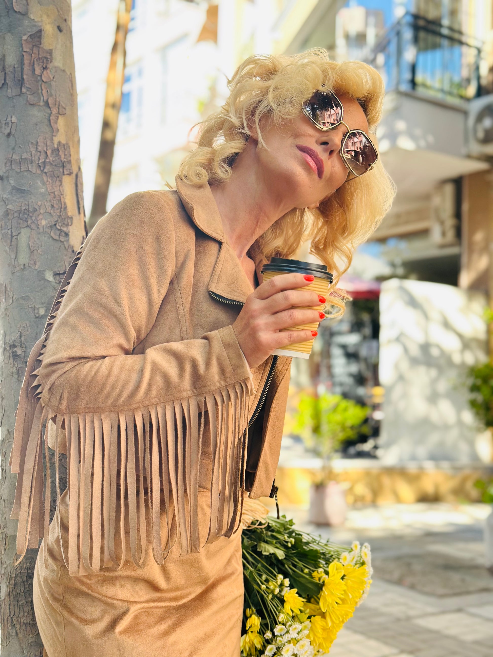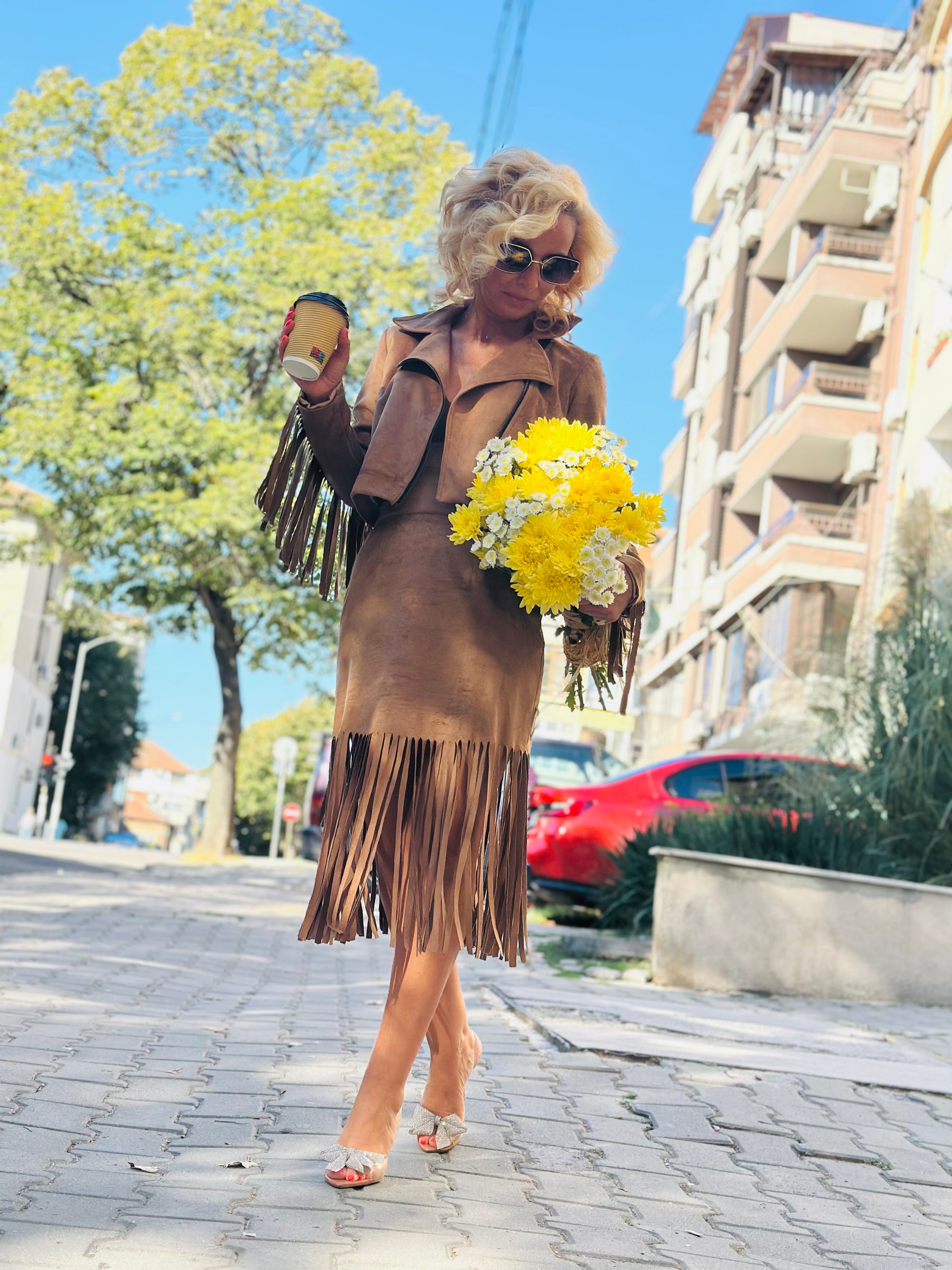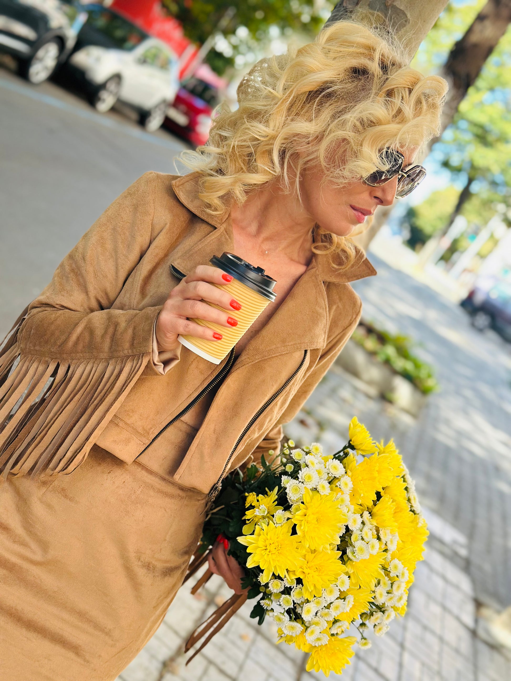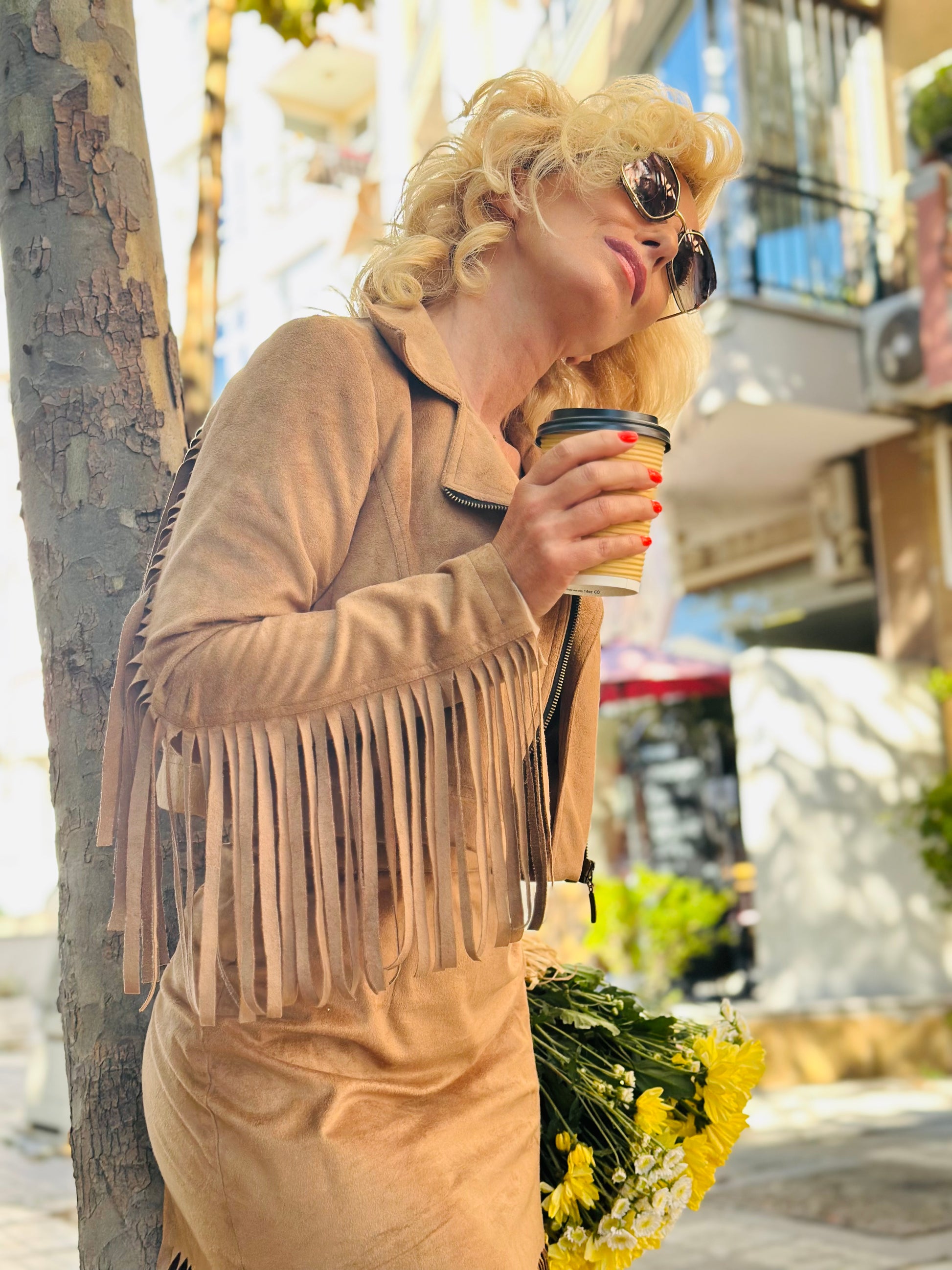 The Fringe Muse Jacket embodies free spirit and effortless elegance. Crafted from soft brown faux suede, it features long fringe along the sleeves and back, adding boho flair and dynamic movement to every step. The cropped cut and asymmetrical front zipper highlight the jacket’s modern edge. Perfectly paired with the matching skirt from the same collection.