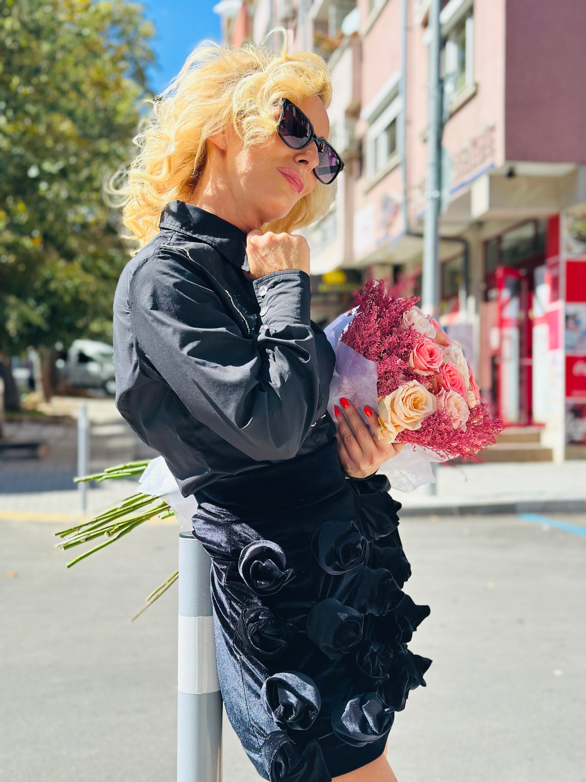 Velvet Rose is a true fashion gem that blends timeless elegance with an artistic touch. Made from luxurious black velvet, this mini skirt is adorned with hand-crafted 3D roses from the same fabric, creating a voluminous and sophisticated dramatic effect. It pairs beautifully with both a crisp shirt and a contemporary top.