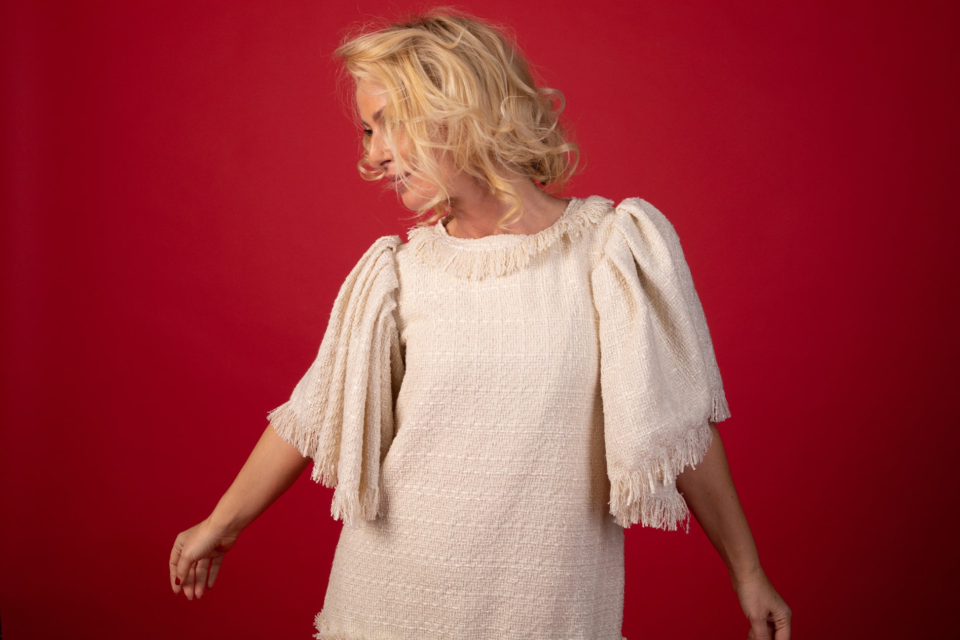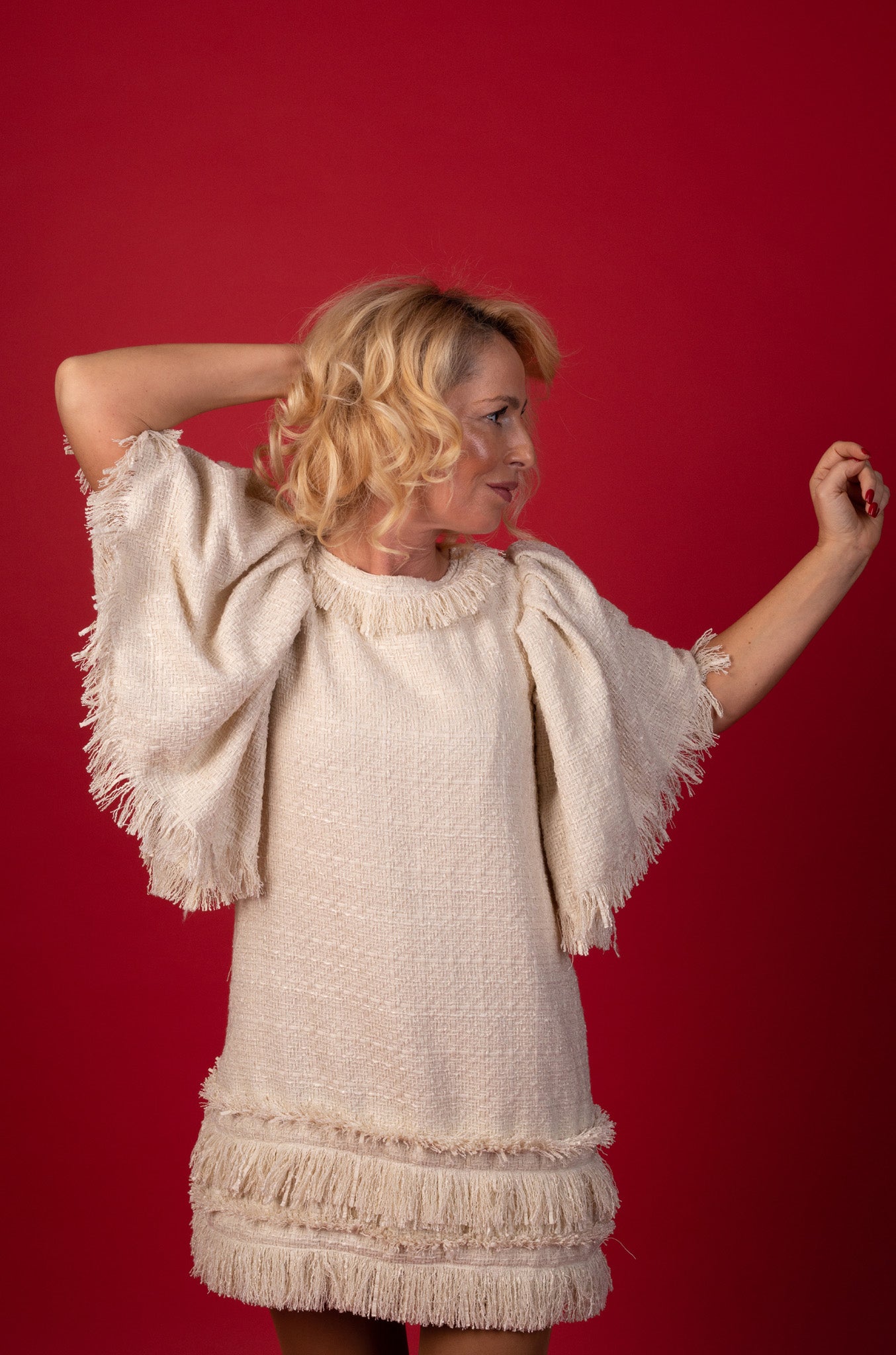 • Детайли: Обемни ръкави, фриндж акценти по деколтето и подгъва