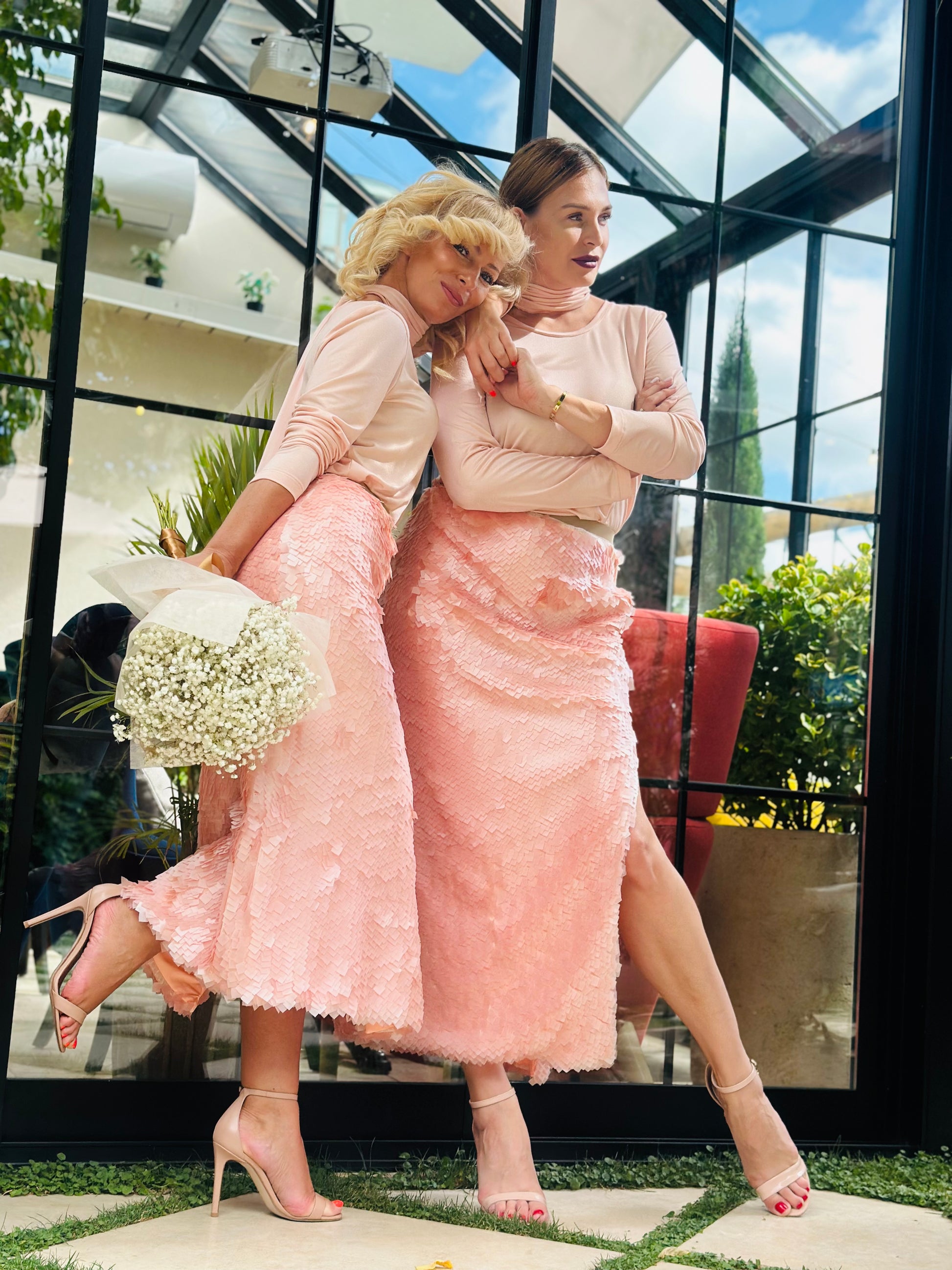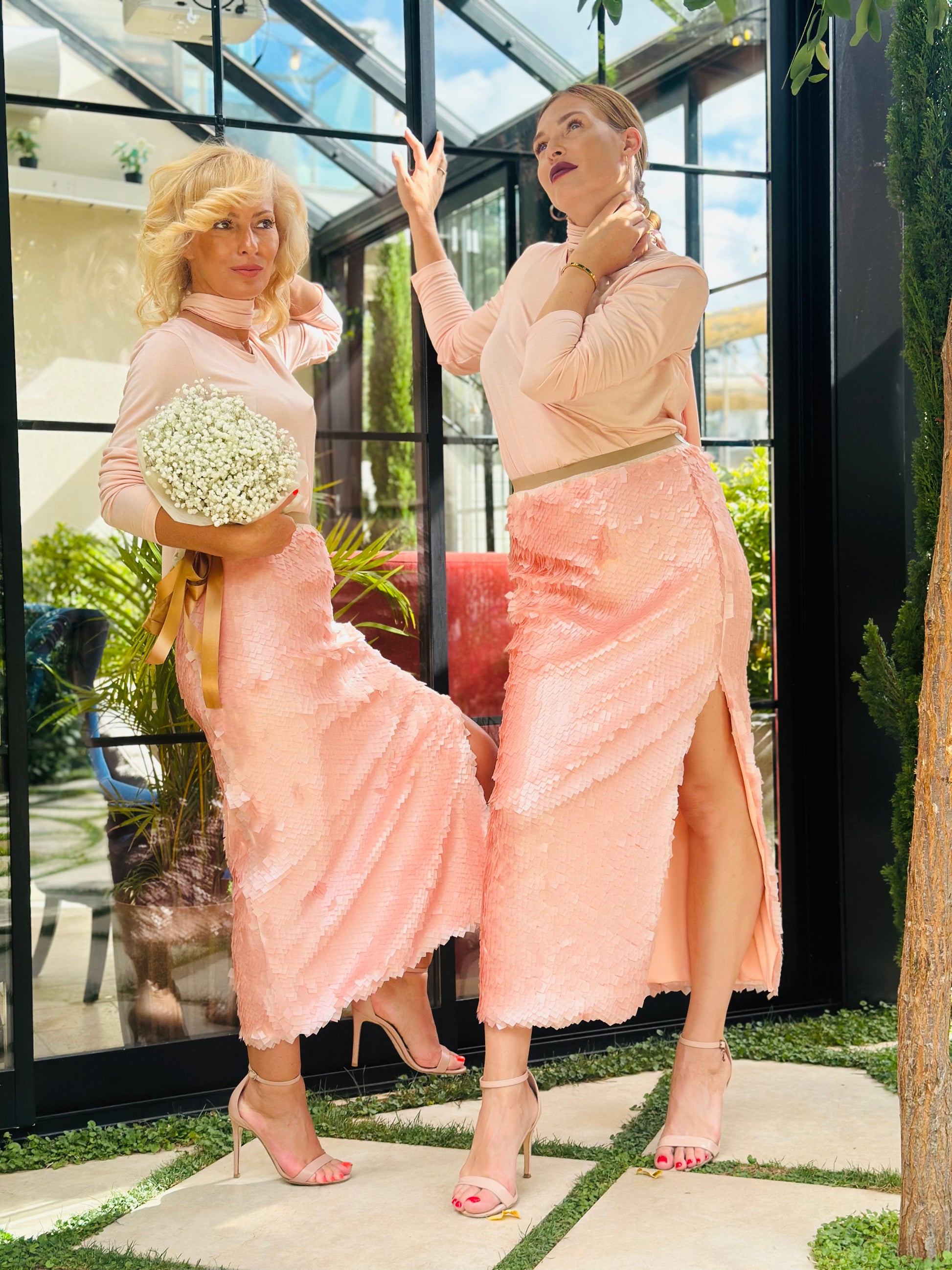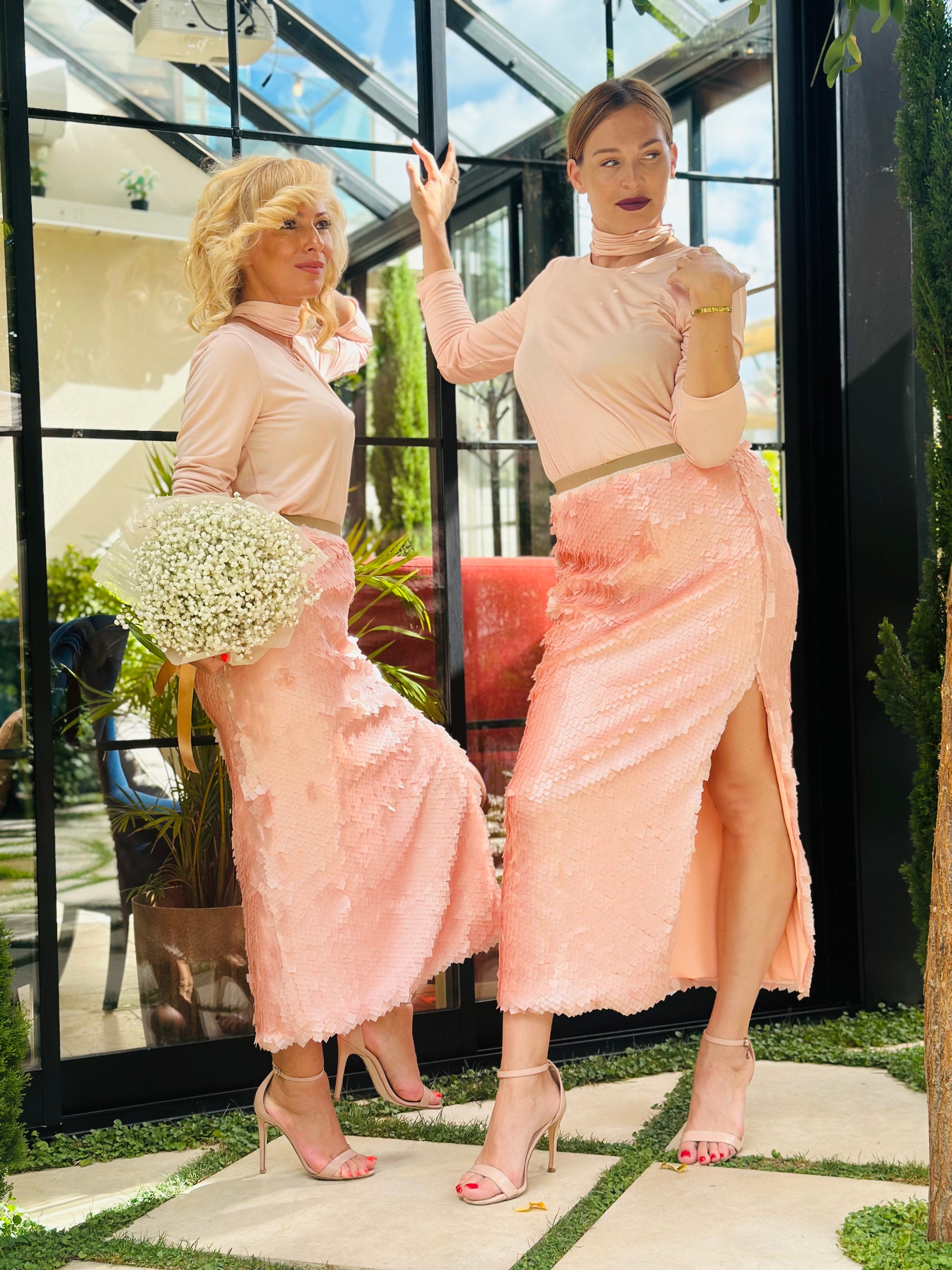 Rosé Sequins е пола, която излъчва блясък и женственост. Изработена от розови бляскави пайети. Тя е с висока талия, миди дължина и стилна странична цепка, която придава движение и елегантен акцент. Идеална за ежедневието или за специални поводи – комбинира се прекрасно с Blush Stardust блузата или с елегантен топ.