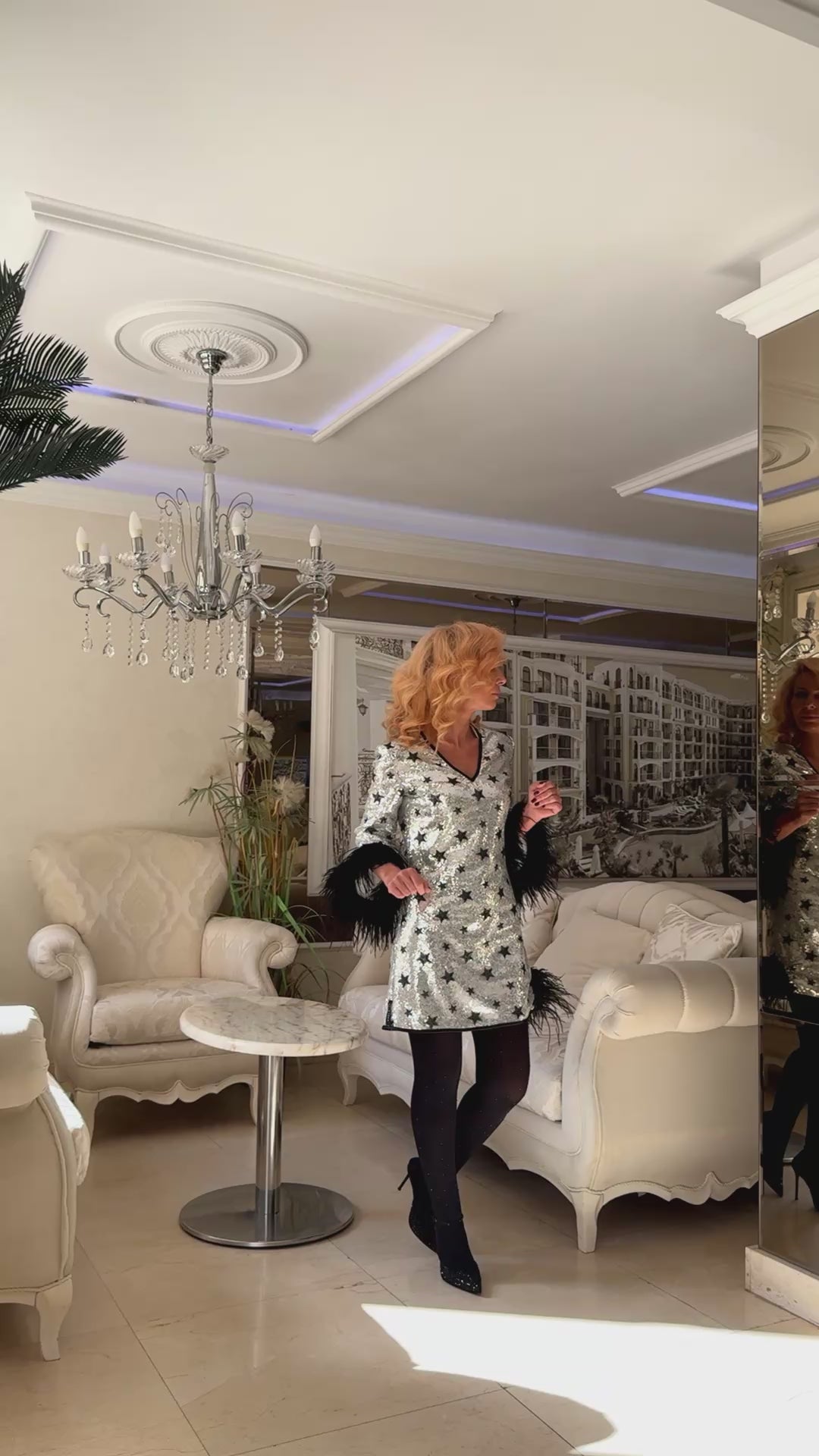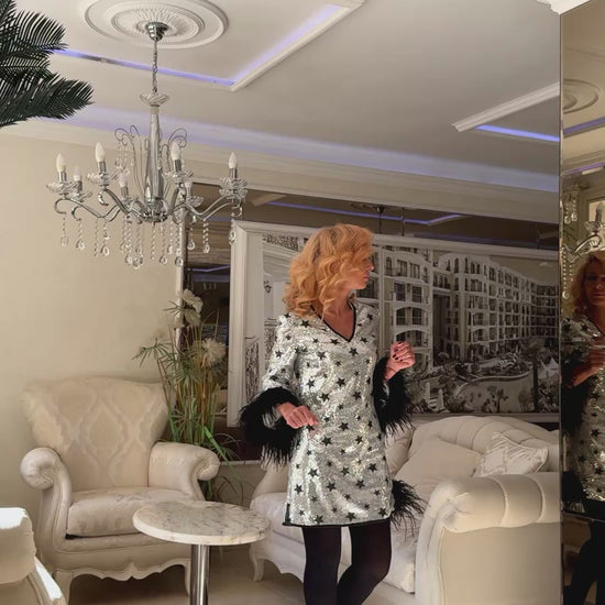 The Star Feather Glam Dress brings striking elegance with a touch of playful sparkle. Crafted from shimmering silver sequin fabric adorned with black star details, this piece captures the magic of festive nights. The A-line silhouette offers a flattering and comfortable shape, while the dramatic black feather cuffs add irresistible movement and couture charm. The neckline features a delicate black trim for a refined finish. Perfect for holiday events, evening parties or any occasion where you want to shine effortlessly.